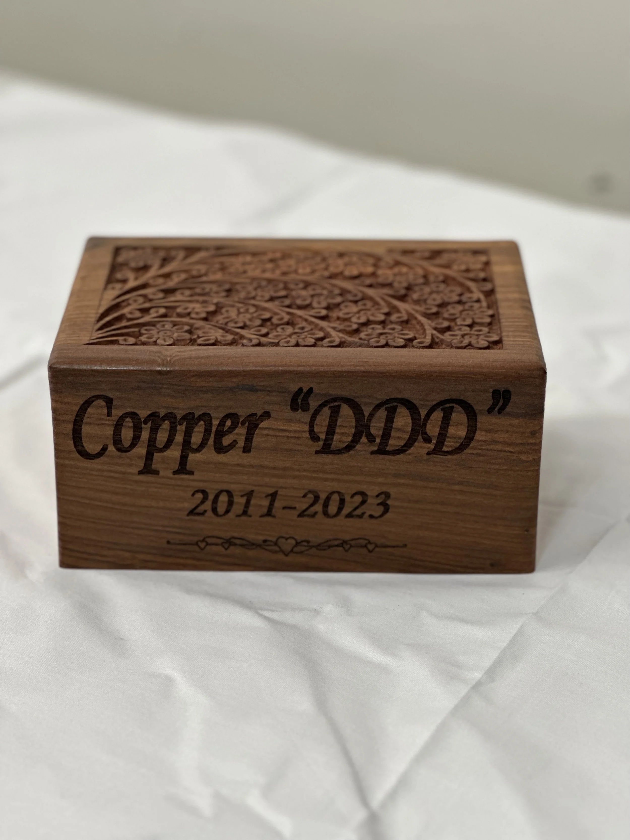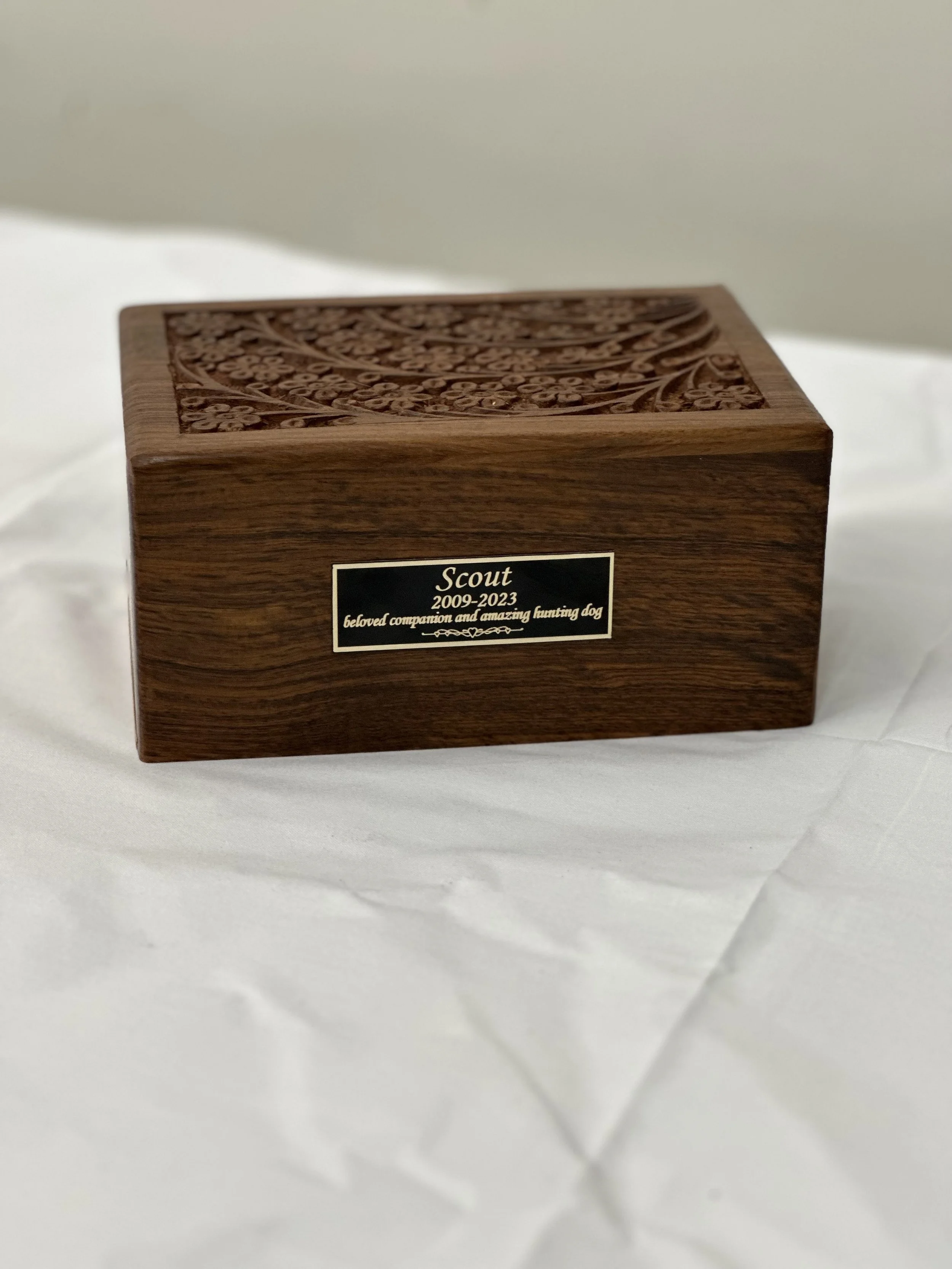 Medium Tree of Life Urn For medium to large sized pets we use our “medium” wooden tree of life urns. These can be customized in multiple ways. From wood engraving to metal name plates. Please contact us regarding customization pricing and options Slide 1 Slide 1 (current slide) Slide 2 Slide 2 (current slide) Slide 3 Slide 3 (current slide) Let us care for your pet today. Contact Us